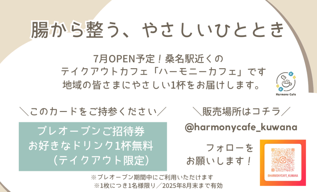 こんにちは、ハーモニーカフェです。 桑名駅から徒歩5分、地域の皆さまに“やさしいひととき”をお届けするテイクアウト専門カフェ 「ハーモニーカフェ」が、飲食店営業許可を取得し、2025年7月12日(土)よりプレオープンする運びとなりました! 🍀 プレオ... -